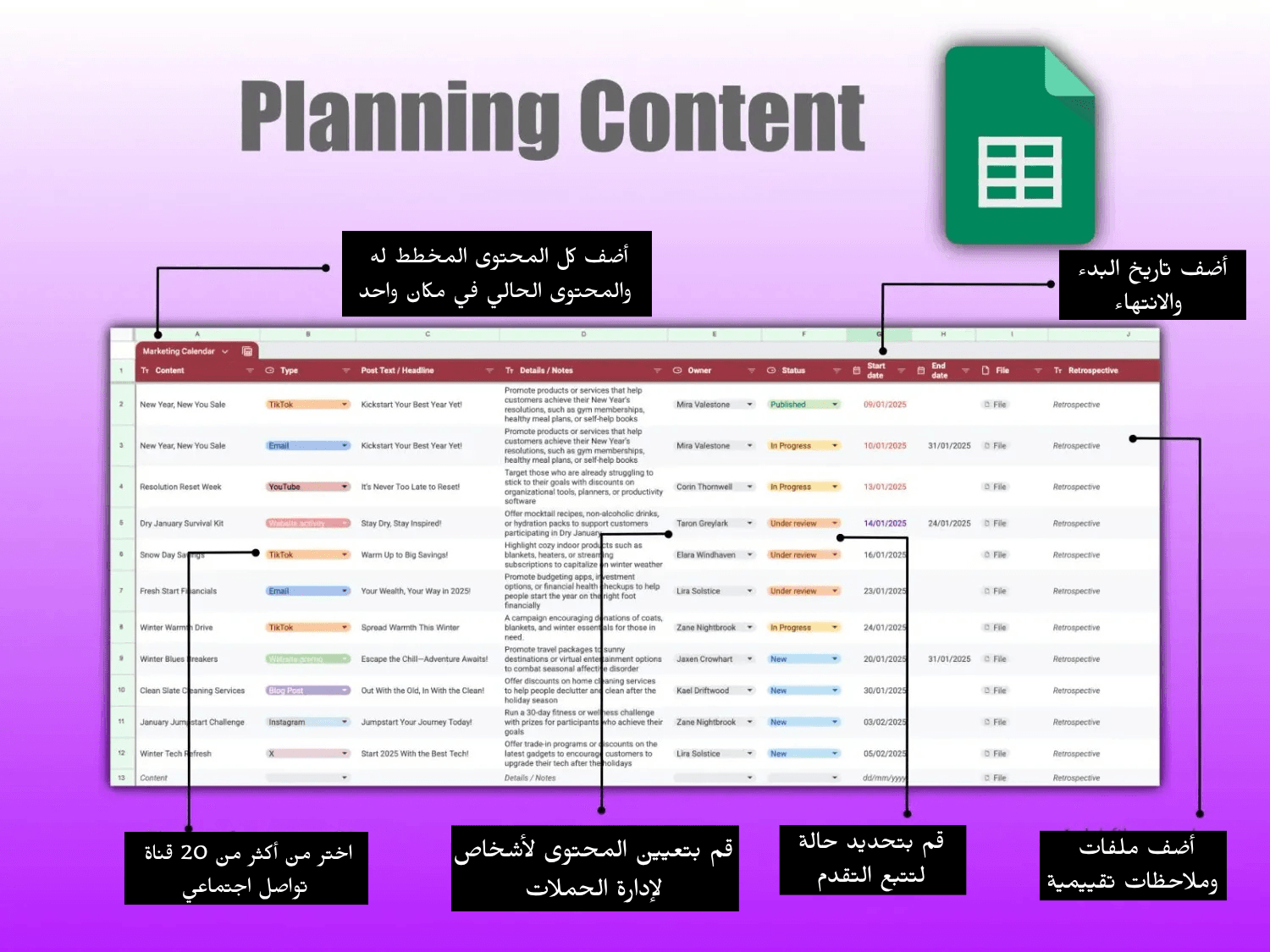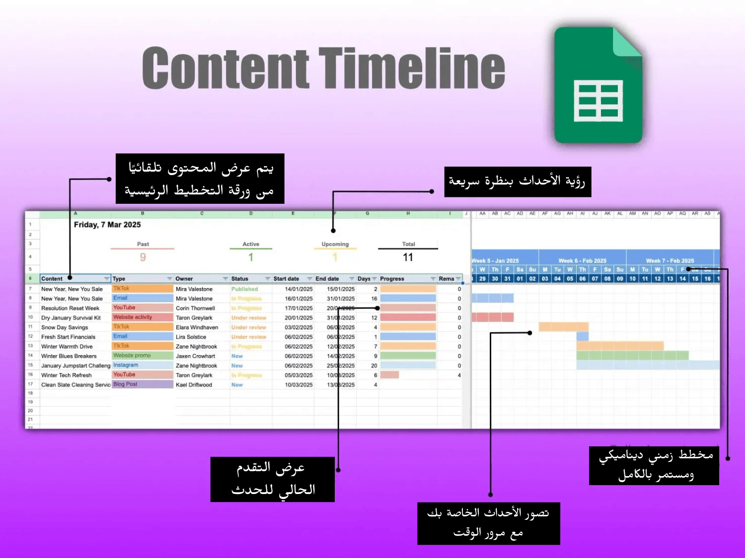 تواجه صعوبة في متابعة حملاتك التسويقية وتنسيق المهام والمواعيد؟ استخدم هذا القالب على جوجل شيت لتنظيم كل حملة بخط زمني وتقويم تفاعلي